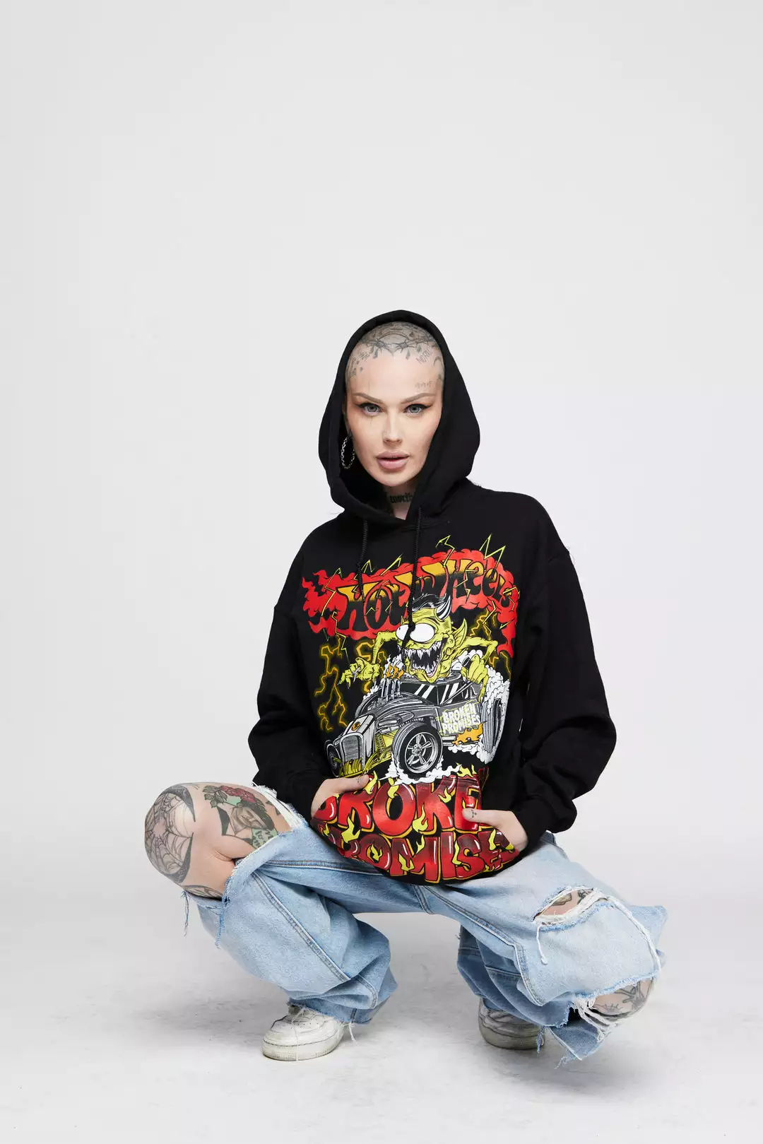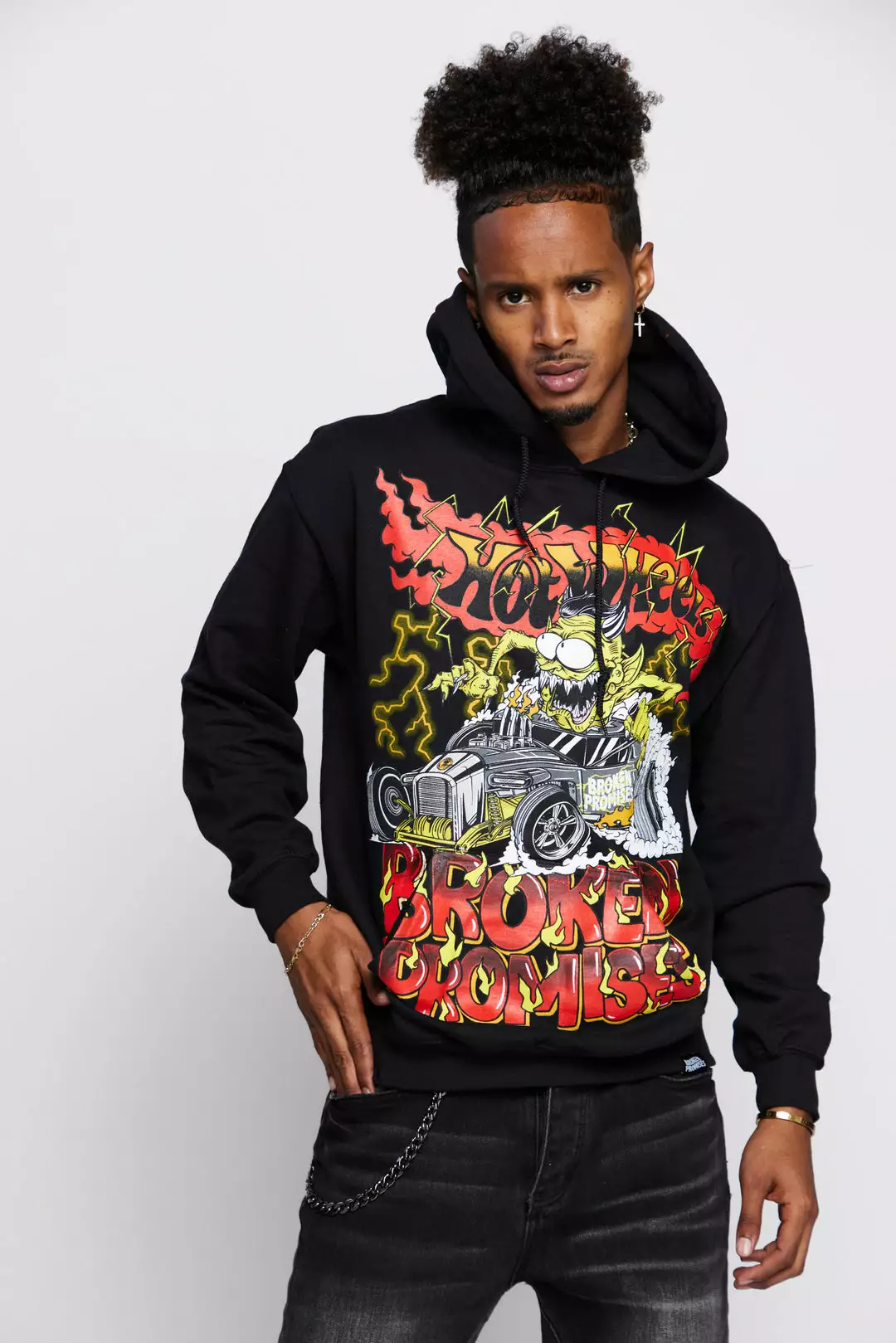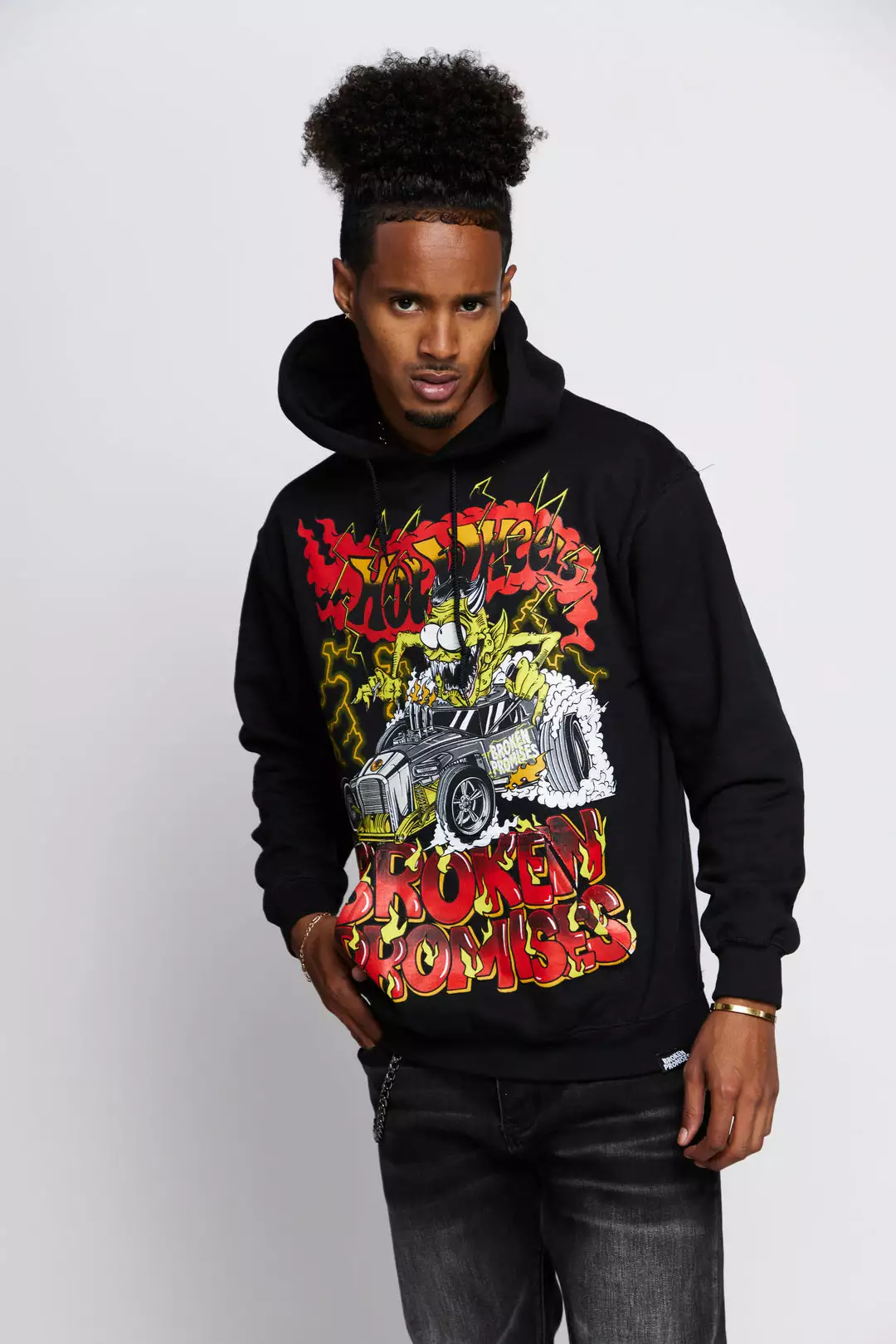 - Graphic features a demonic character on a Broken Promises Mod Rod inspired by the official Broken Promises x Hot Wheels die-cast.Â